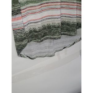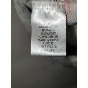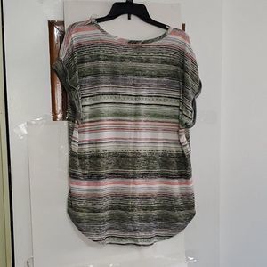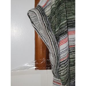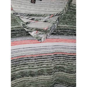 Cute pullover top by Almost Famous. This is a light knit piece with cap sleeves and a criss-cross strap at the neckline. Horizontal stripes go all of the way down the top in grays and pinks. This piece is very soft, it is 60% polyester, 38% rayon and 2% spandex. 26" from armpit to armpit and 27" from shoulder to hem. In very nice pre-owned condition.
