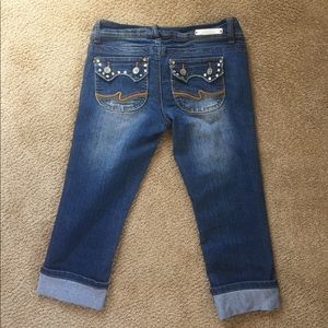 Super cute Almost Famous jean capris. Ripped details in the front and rhinestone details on all the pockets