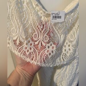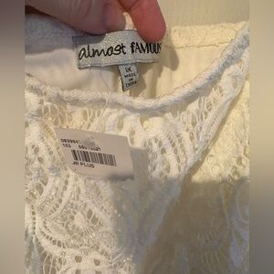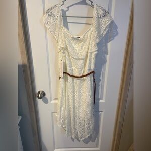 Almost Famous juniors plus off shoulder high low off white lace dress. Has brown belt for accent. New with tags.