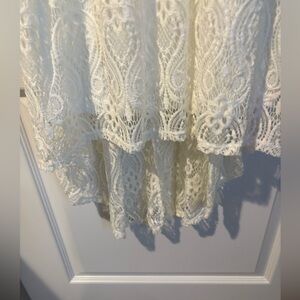 Almost Famous juniors plus off shoulder high low off white lace dress.