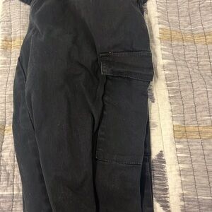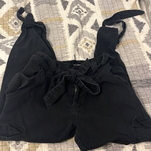 Features waist tie as well as ankle ties, cargo style pockets, and elastic waist band.