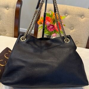 Authentic Gucci Black Pebbled Soho bag. Sophisticated Gucci shoulder bag with elegant chain straps and signature GG logo detail. In almost unused condition and still smells like new. The only flaws are few tiny pen marks inside. Dust bag included.