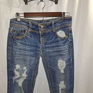 Almost famous distressed size 3 jeans side to side measurements is 15.5 " rise is 7" inseam is 31" top of waist to bottom hem is 39" Bundle more items for bigger deals Bin-125
