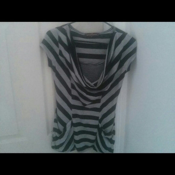 Very cute almost famous black and grey striped dress shirt, has very cute pockets on both the left and right side of the shirt to carrying anything you need. Size is small