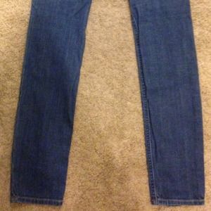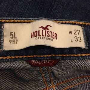Hollister destroyed skinny jeans size 5 long. Very comfortable and only been worn around 3 times. Super cute on and with any outfit. They just don't fit anymore or I'd keep them. And even if you're short you can roll the ends and they fit and still look cute, that's what I did and I am 5'2" and they fit once rolled. Waist is 27 and length is 33.