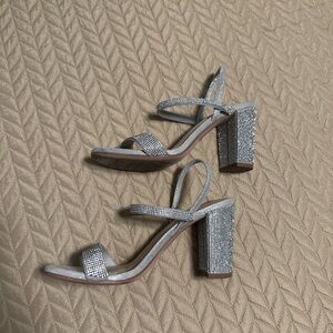 Built for dancing all night! Super comfortable block heel. All rhinestones accounted for too. 3.5 inch heel. Worn once for a wedding. Minor scuffs on the front of the footbed; hard to get good pictures. Cannot be seen when worn.