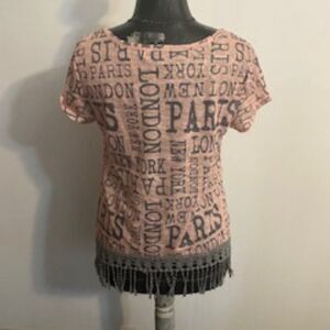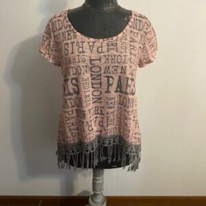 Almost Famous Peach/Gray Hi-Lo with fringes short sleeve top, size XL (100% Polyester)