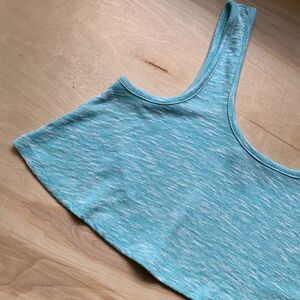 Almost Famous crop top is a turquoise and white blend. Round scoop neckline and back. 1” straps. Underarm flat across is 20”. Length is 16”.