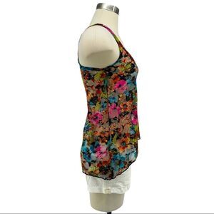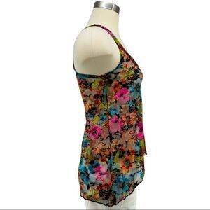 Sheer lace racerback tank top in super cool bright multi-colors: pink, blue, green, yellow, orange, and black. Neon orange zip front adds an edgy look. Zipper slides back & forth easily. Soft comfortable lace material (does not itch at all). Breathable shirt, perfect for summer. Pairs best with a nude racerback cami or racerback bralette. Cute with olive shorts. Discontinued style. Smoke-free and pet-free home.