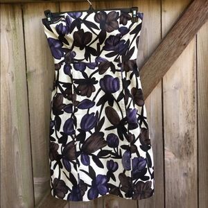 Almost new; Gorgeous floral (shades of cream, purple, brown, and black) strapless dress with back zip; lined; cotton/polyester/spandex; Smoke-free/pet-free home.
