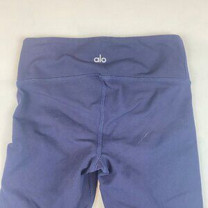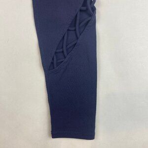 Blue-Purple leggings feature cut out cross details along legs, logo on back waistline.