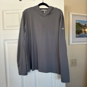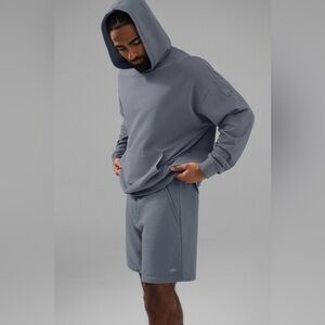 Cozy navy blue hoodie by Alo. Features a drawstring hood and relaxed fit.