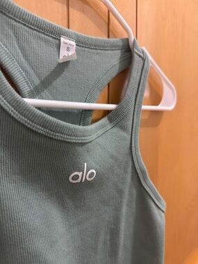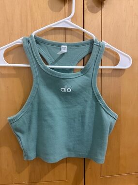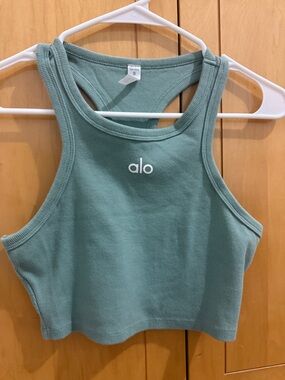 Ribbed cropped tank with racerback. Soft stretchy knit. White Alo logo at center front. Versatile casual athleisure piece. Size small