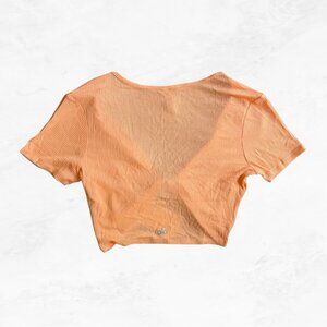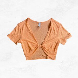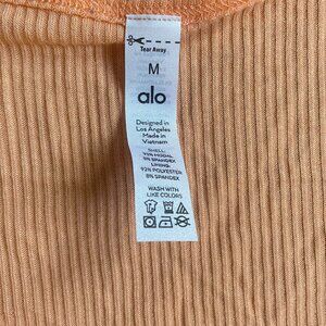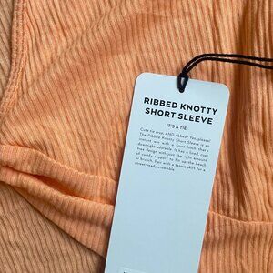 Alo Ribbed Knotty Short Sleeve + Super-soft, fine sweater knit crop top + Ribbed design with front knot detail + Deep, V-neckline, cropped fit & short sleeves Size: M Condition: NWT Color: Cantaloupe Materials: 95% Modal, 5% Spandex Approximate measurements, lying flat: + P2P: 19" - stretches to 22" + Length, shoulder to hem: 16"