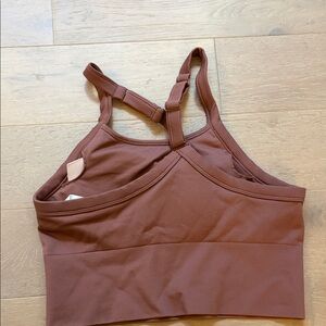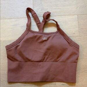 Alo ribbed sports bra. Strappy back and wide underband for support. Soft, stretch fabric with subtle texture. Versatile dusty rose color.