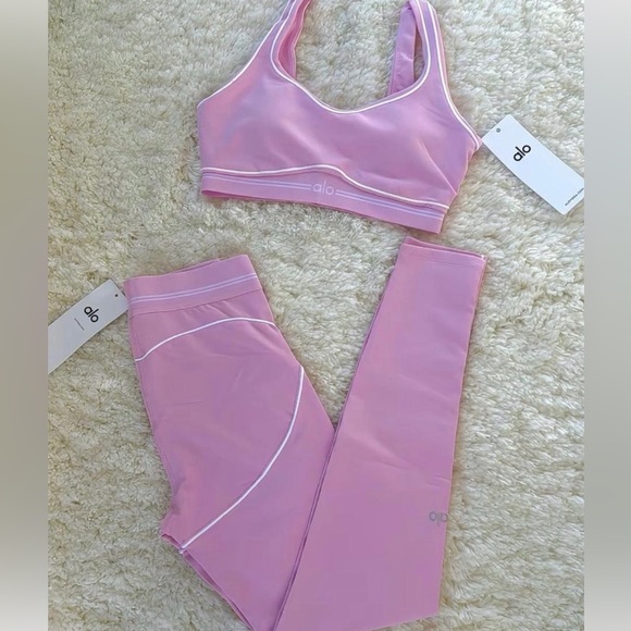 Matching two-piece active set by ALO Yoga. Seamless sports bra with supportive band. High-rise leggings with contrast piping detail. Smooth stretch fabric for workouts or casual wear.