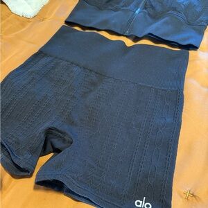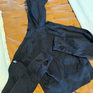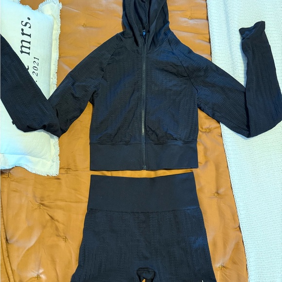 Two-piece active set. Textured black zip-up hoodie. High-waist matching shorts. Stretchy, athletic fabric. Simple sleek style. Great for workouts or casual wear. Would prefer to sell together. Can sell separate. XS jacket. Small shorts.