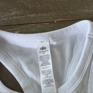 Alo white cropped ribbed tank top. Features a sleeveless design with a round neckline.