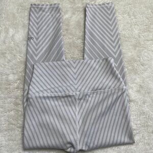 Pre-owned authentic Alo Women's White Grey Cropped Mid Rise Striped Leggings Size XS. Aprox measurements: Rise is 9" inches. Waist laying flat is 9.5" inches. Inseam is 20" inches. Great condition. Please look at pictures for better reference. Let me know if you have any other questions. Happy Shopping! NAPR25. B13