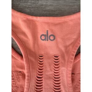 Bold and stylish Alo Yoga cropped tank top in vibrant neon orange. Features an intricate laser-cut, distressed pattern with a seamless racerback design. Tag is missing, but based on measurements, it fits like a size L (please see photos for exact dimensions).