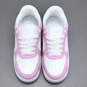 The tongue features the brand's signature "alo" embossing. The shoe is primarily white with light pink accents and features perforated toe caps.