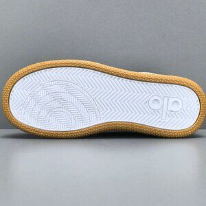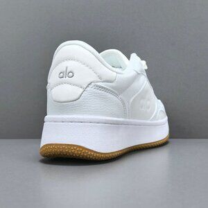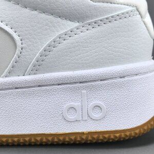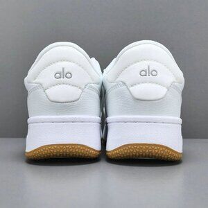 The tongue features the brand's signature "alo" embossing. The shoe features a predominantly white body with white accents and a perforated toe cap.