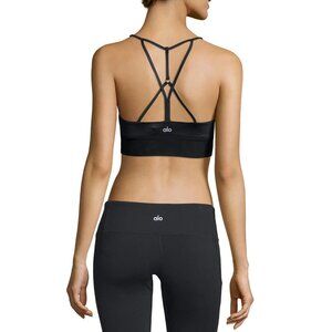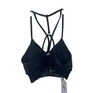Elevate your workout wardrobe with this high-performance Alo sports bra. Designed for the fashion-forward fitness enthusiast, its intricate strappy back and glossy fabric create a sophisticated athletic aesthetic. The strategic mesh paneling provides breathability while the removable padding offers customizable support.
