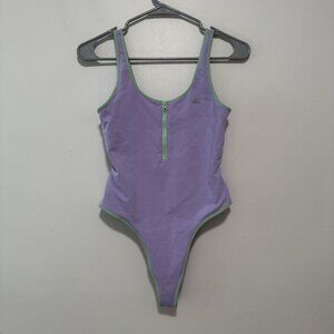 Alo Yoga Supernova Purple Thong Bodysuit Green Trim Zipper