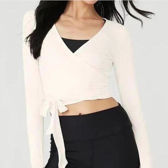 ivory crop top, wrap style, athletic wear, ballet-inspired, yoga top, stretch fabric, cropped blouse, casual activewear