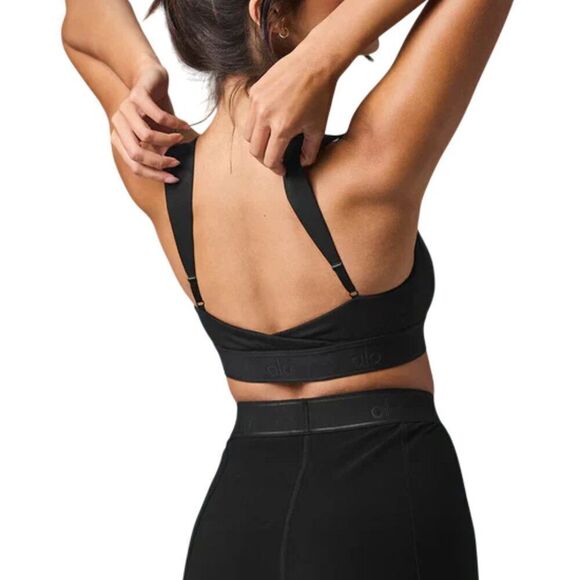Enter Center Stage: the Alosoft Molded Showcase Bra. Made with Velvety-Soft Alosoft Fabric, a Repeating Alo Logo Band, and Front Zipper, This Style Is Perfect Solo or Layered. the Subtle V-Shaping on the Back and Flat, Satin Elastic Straps Pair Perfectly with the Matching Alosoft Showcase Short. Stylish Black Sports Bra with a Front Zip. Features Alo Branding. Comfortable and Supportive.