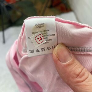 -pink polyester/spandex blend material with stretch.