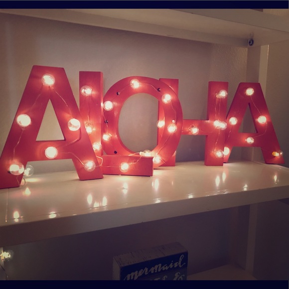 Light up bulbs in coral painted letters. Super cute decor! Battery powered.