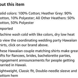 Both shirts are brand new. Never used. Never even tried on. Selling together as a set/bundle. The color is blue in the navy color. Item comes from a non smoking home. Women’s Shirt: XXL and Men’s Shirt is Large. Please note that sizing/fit may vary. Both say Aloha Bride or Groom with a pineapple from Hawaii on it. Perfect for your honeymoon or a gift for newlyweds too! Nothing on the sleeves or back side. Purchase includes fast and secure shipping. Thanks for looking! :)