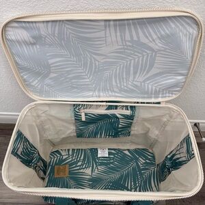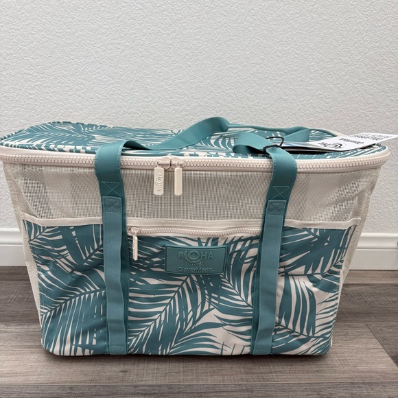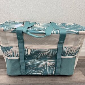 Insulated cooler tote with tropical teal leaf print. Features teal straps and beige trim. Zipper closure and front pocket. Great for picnics and beach days. NWT. From smoke/pet free home