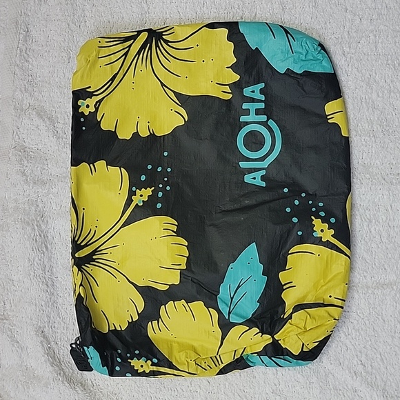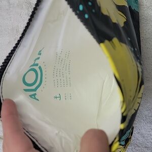 This is from the Aloha Collection Black Label. The pouch is black with yellow hibiscus flowers and blue leaves. It's about 7.5"L and 9.5"W. Gently used like new.