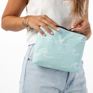 Aloha Collection small light blue pouch with white wave pattern. Perfect for organizing essentials. Light weight, splash proof with white interior. Lightly used and still in great condition.