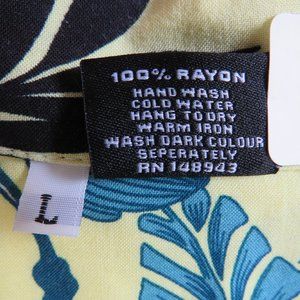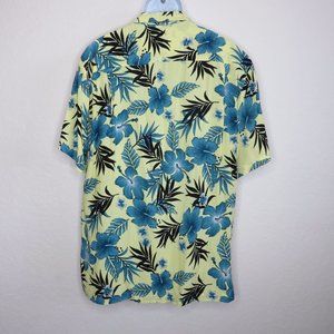 Pre-Owned Condition! 100% Rayon. Handsome Hawaiian Aloha Yellow, Blue & Black Floral Button Down Single Chest Pocket Shirt with Matching Wood-Like Buttons.
