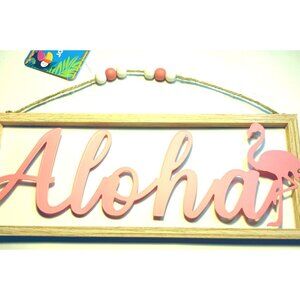 Aloha Flamingo Sign Hanging Wall Decor Beaded String Pink White Beachy Coastal