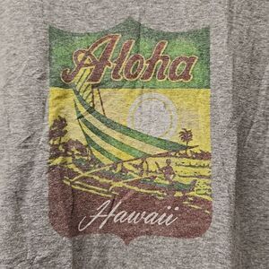 This is an Aloha Hawaii t-shirt. It has a graphic of an Outrigger Canoe at sunset.
