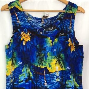 Embrace the vibrant spirit of the tropics with this stunning sleeveless dress. Featuring a beautiful blue and yellow pattern, it's perfect for sunny days and beach outings. Enjoy comfort and style in one elegant piece. Smocked top, flowy skirt.