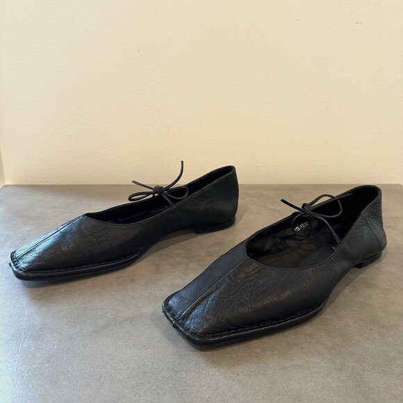 Crafted from classic black leather, the Sway ballet flats feature V-cut vamps accented with self-tie bows framing the instep and square toe.