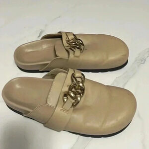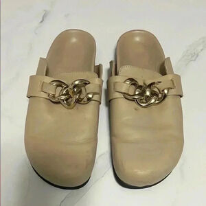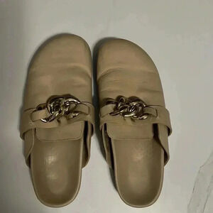 Step out in style with these chic beige mules featuring a bold chain detail. Perfect for adding a touch of elegance to any outfit.