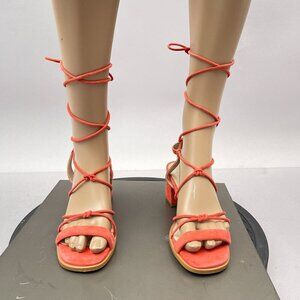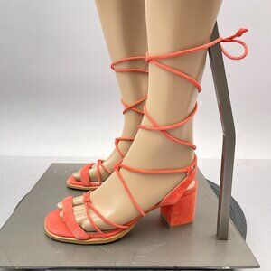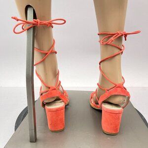 Step into style with these vibrant coral suede sandals, featuring a chic lace-up design and comfortable block heel. Ideal for dressing up warm weather outfits.