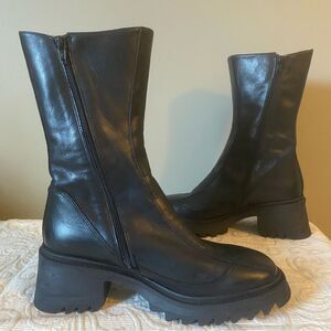 Rare! Turn heads in these bold and modern ankle boots by Alohas. Features black leather uppers and chunky rubber soles. A slip-on and zip up style which makes them easy on/off with assured comfort, style and edge in every step. Heel 2.5”, platform 1”. Size 41
