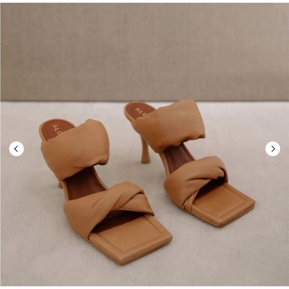 Alohas twist strap mule heels in camel tan color size 38 (7.5) square toe and padded straps