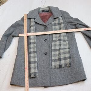 Classic vintage-style Alorna wool-blend coat in heather gray with matching plaid scarf. Made in USA. 70% wool / 30% nylon, fully lined. No size tag—please see measurements: approx. 21" pit to pit, 31" length, 22" sleeve. Button front, large pockets, cozy feel.