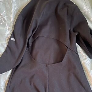 Sleek black hoodie and leggings set by Alo. Perfect for workouts or casual wear.