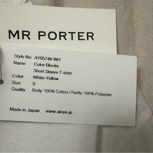 It’s a NWT white tee with geometric colorblock panels of navy blue, mid blue, and neon green (tag says yellow but it’s closer to green). Notably, the neon panel features a special jersey fabric. Made in Japan.