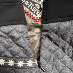 Alp-N-Rock heather black quilted shorts with black waist band. Beautiful embroidered white daisies lining the pockets with a solo accent daisy near the of the shorts. Side zipper with clip.