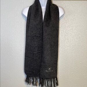 This elegant gray scarf is crafted from a soft woven fabric, featuring delicate fringe detailing at both ends. Its versatile design makes it a sophisticated accessory to enhance any ensemble. Scarf is dark charcoal grey, is unisex. Excellent, like new. Measurements: 64” + 4” fringe on each end x 9” wide.